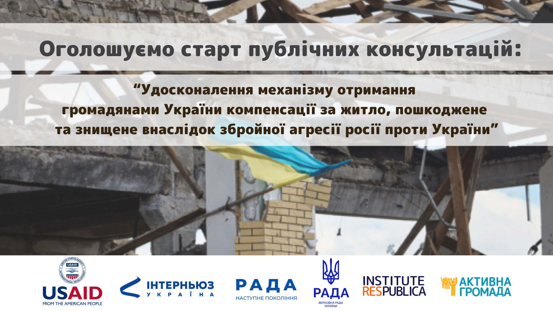 Саме тому Голова комітету Верховної Ради України з питань організації державної влади, місцевого самоврядування, регіонального розвитку та містобудування Олена Шуляк у партнерстві з ГО ‘‘Інститут Республіка’’ запрошують до публічних консультацій громадян, юридичних осіб, чиє житло було пошкоджене, або знищене внаслідок збройної агресії росії проти України. А також народних депутатів, представників міністерств, надавачів послуг, які залучені до механізму компенсацій, представників громадських організацій та інших спеціалістів та експертів з питань даної теми.