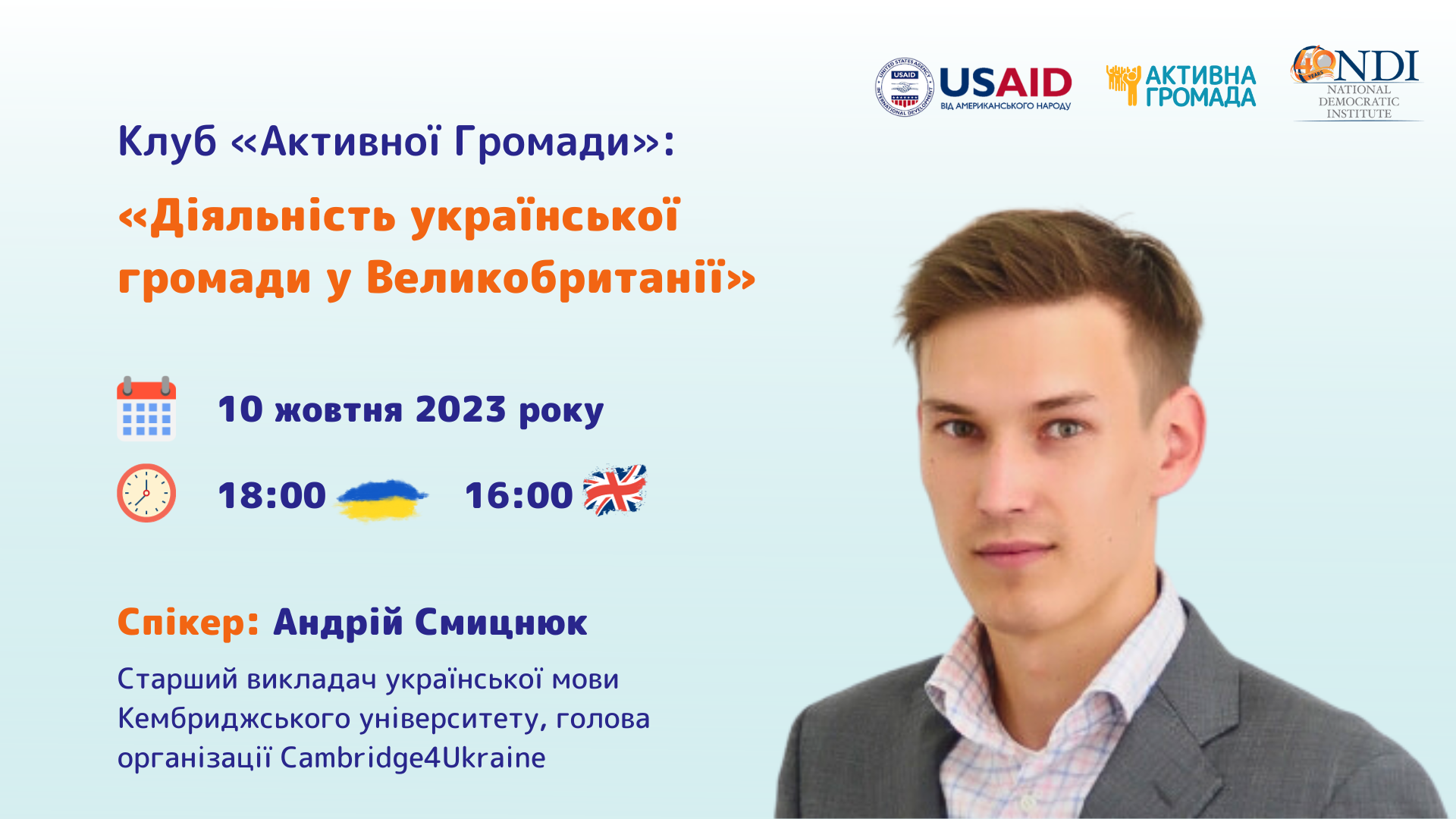 ВІ "Активна Громада" запрошує всіх діаспорян за кордоном, українців, які тимчасово перебувають в інших країнах через війну в Україні, та українців в Україні долучитись до Клубу Активної Громади за участі Андрія Смицнюка.