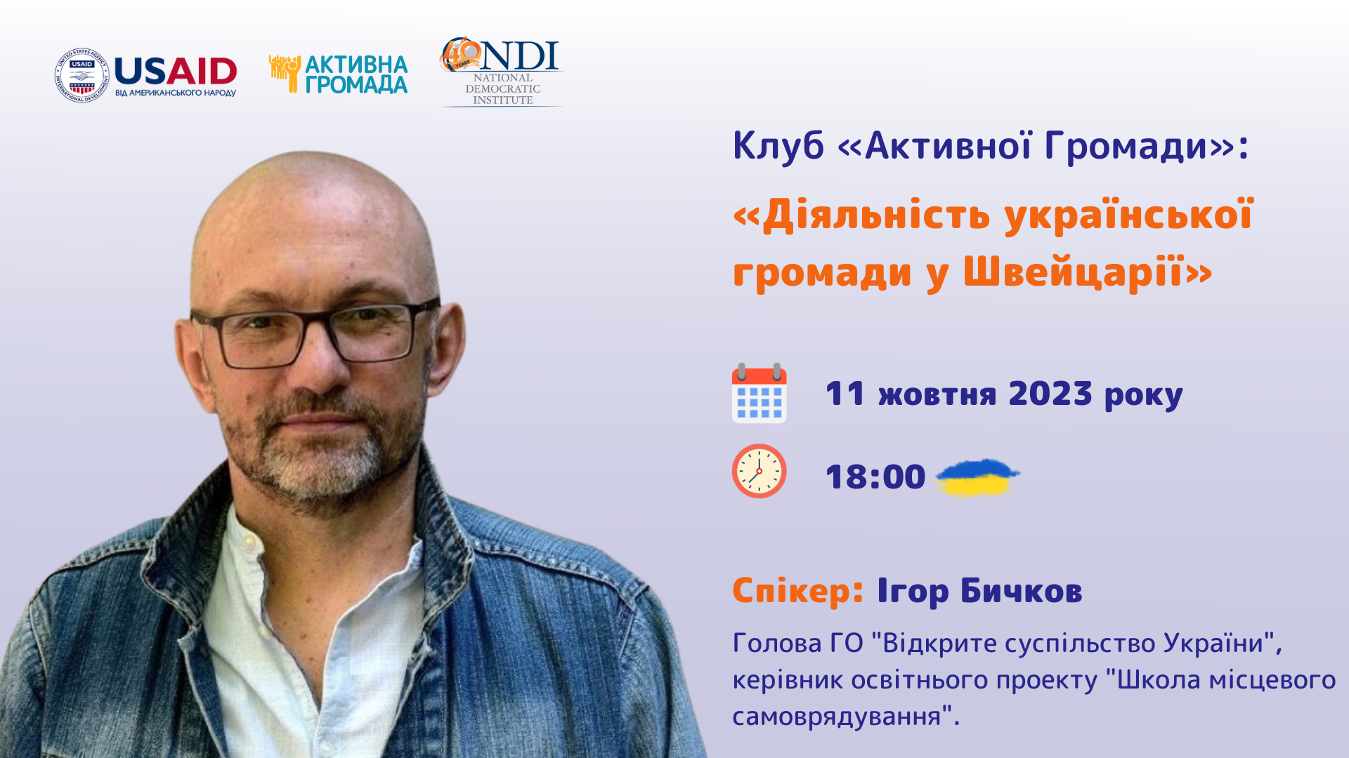 ВІ "Активна Громада" запрошує всіх діаспорян за кордоном, українців, які тимчасово перебувають в інших країнах через війну в Україні, та українців в Україні долучитись до Клубу Активної Громади за участі Ігоря Бичкова.