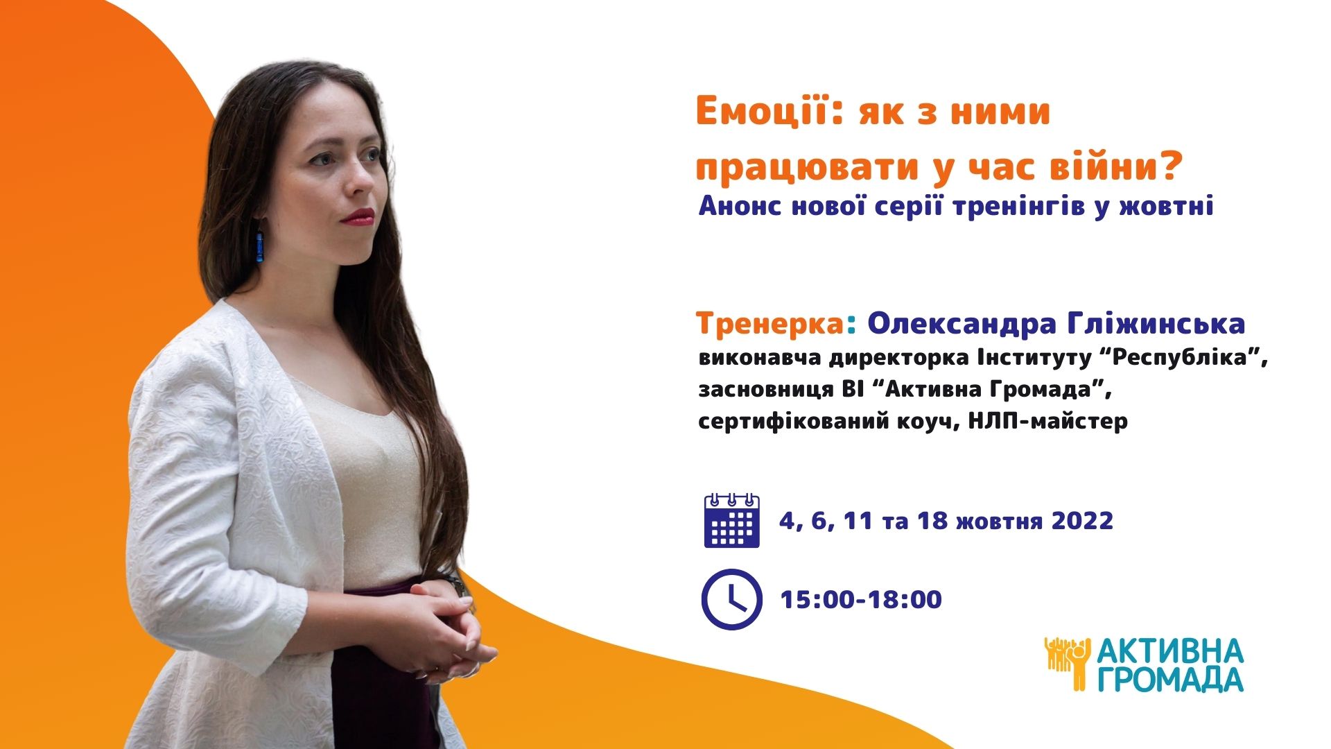 Разом з тренеркою Олександрою Гліжинською будемо розбиратися, як жити в злагоді зі своїми емоціями та переживаннями.
