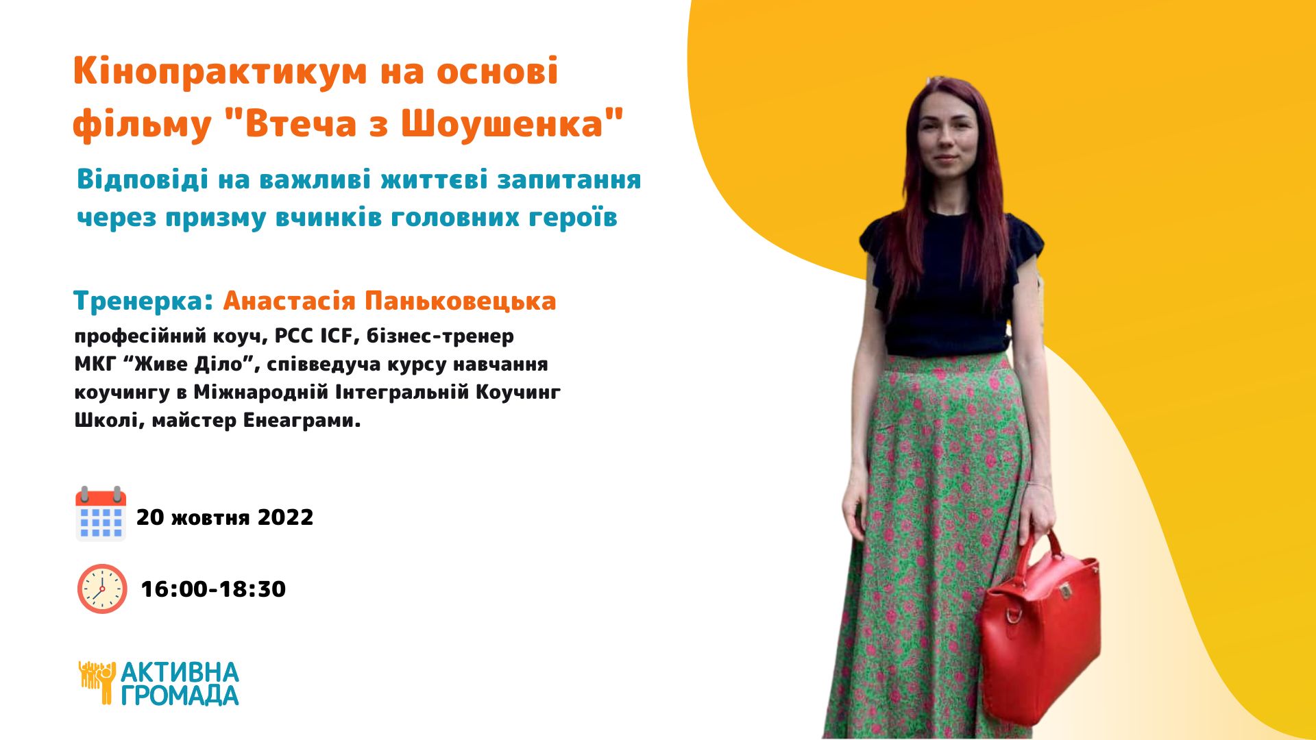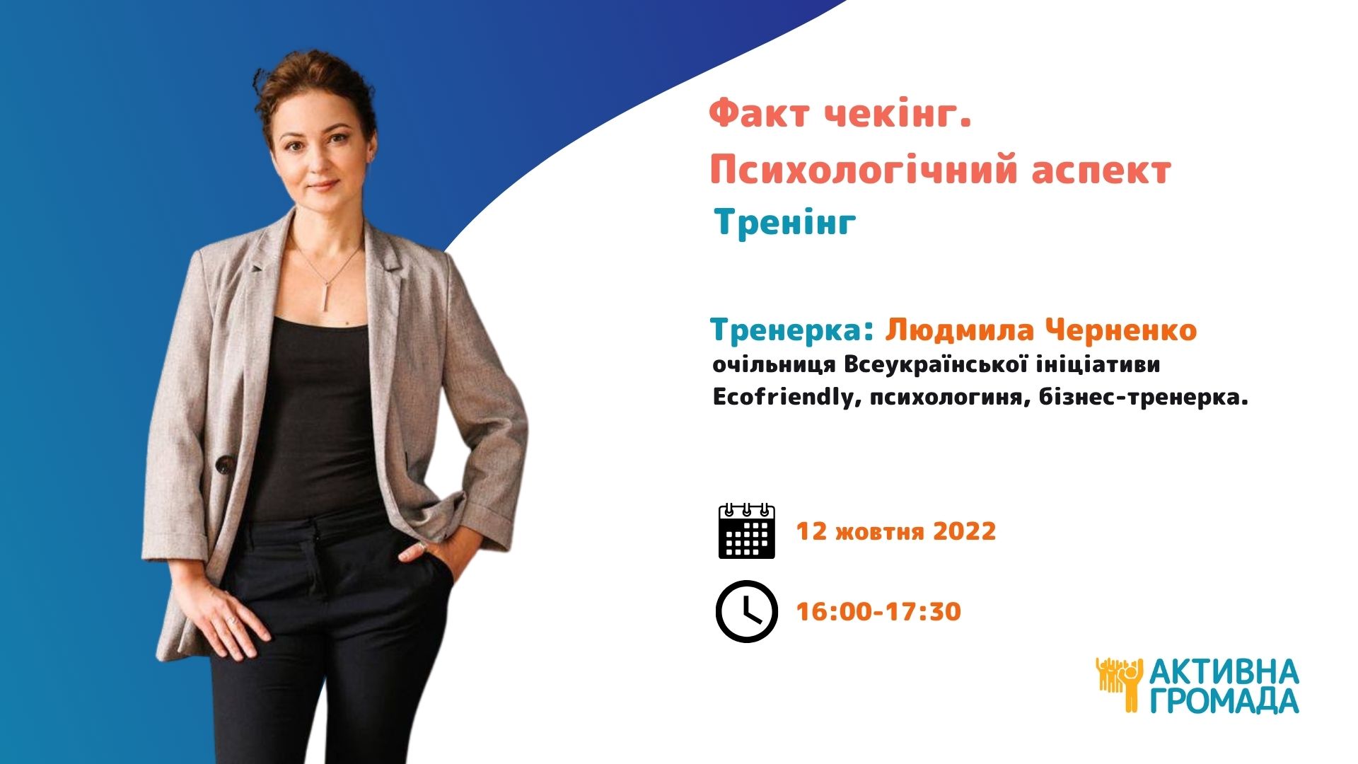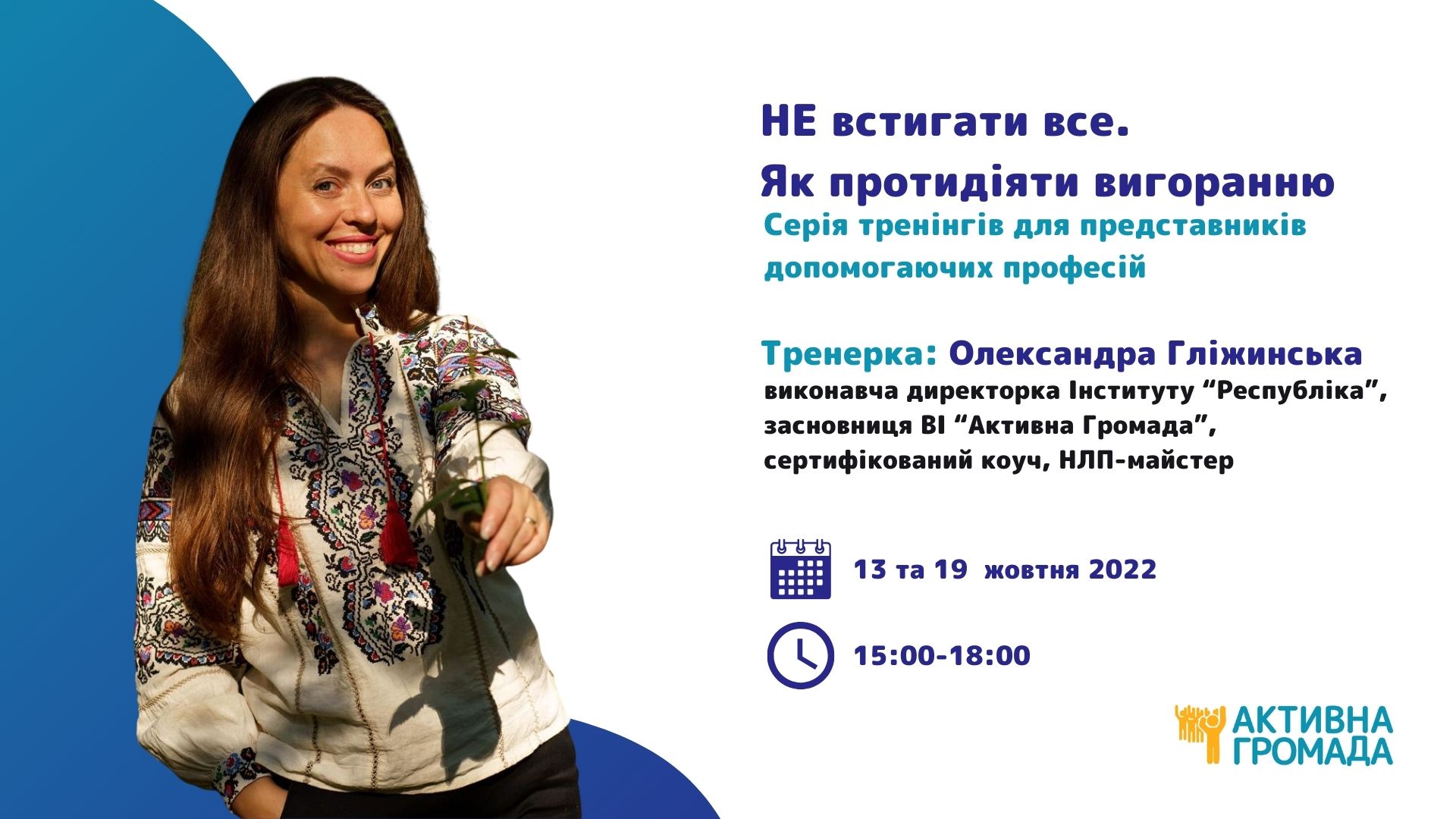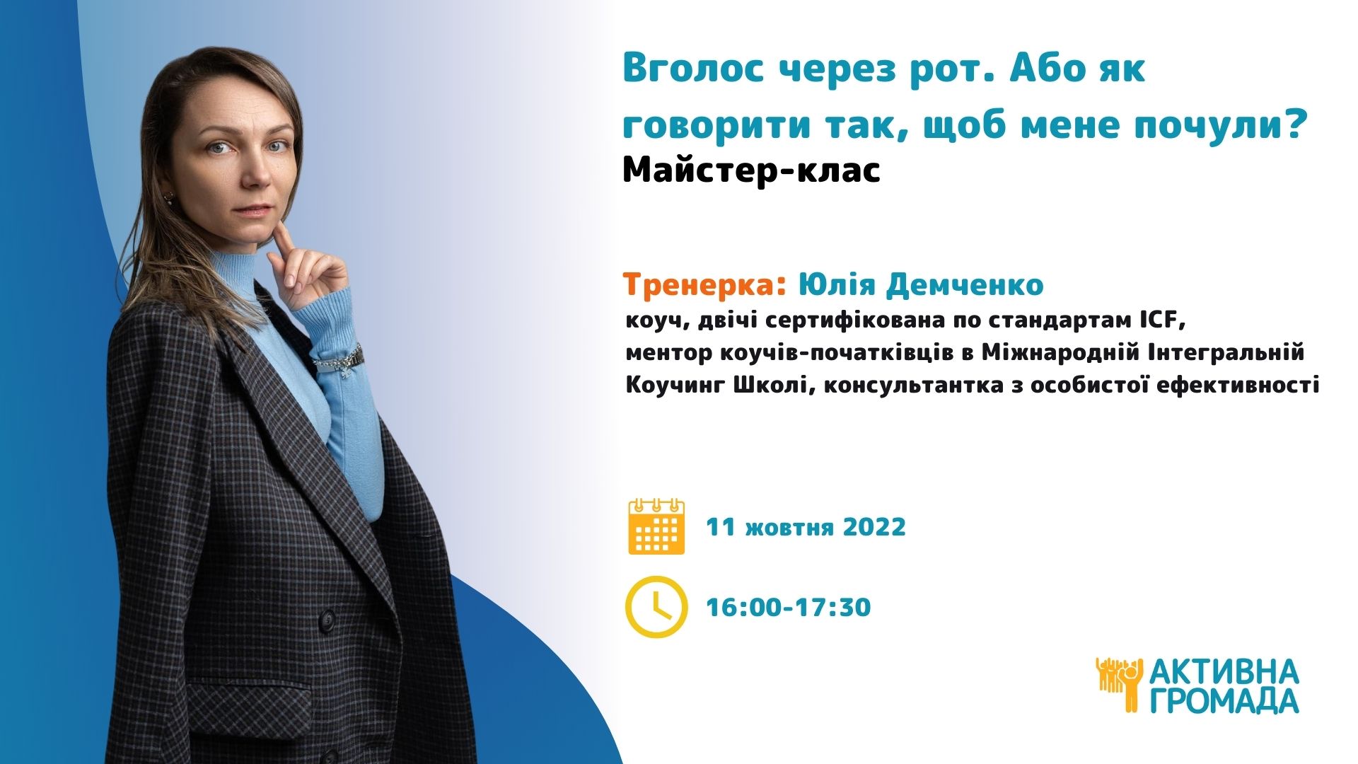 Тренерка: Юлія Демченко, партнерка ВІ “Активна Громада”, коуч, двічі сертифікована по стандартам ICF, ментор коучів-початківців в Міжнародній Інтегральній Коучинг Школі, консультантка з особистої ефективності.