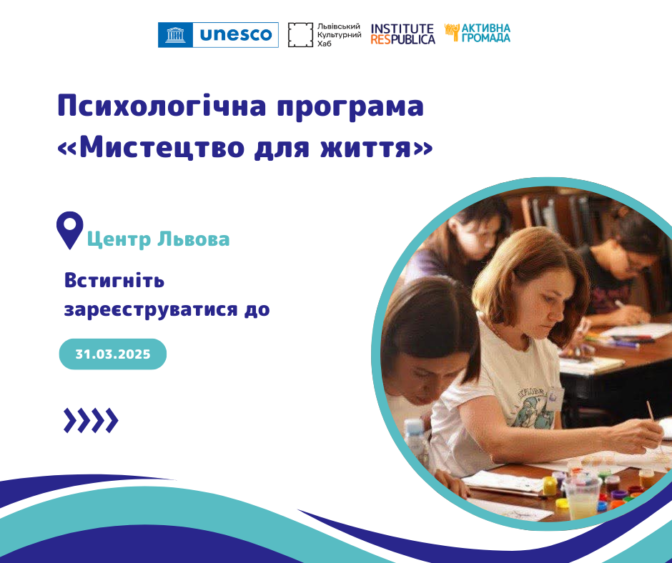 Програма «Мистецтво для життя» спрямована на підтримку психічного здоров’я та відновлення українців через поєднання психотерапії, мистецьких практик і культурних традицій. Вона допомагає тим, хто стикається з посттравматичним стресовим розладом (ПТСР) і тривожністю, використовуючи музику, театр, живопис та інші творчі методи.