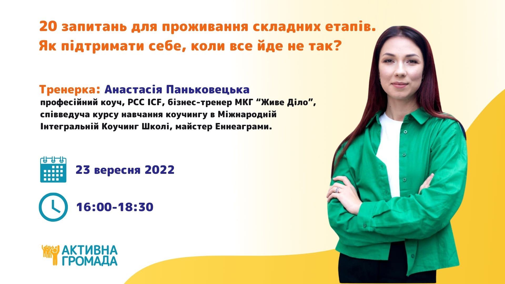 Тренерка: Анастасія Паньковецька, партнерка ВІ “Активна Громада”, професійний коуч, PCC ICF, бізнес-тренер МКГ “Живе Діло”, співведуча курсу навчання коучингу в Міжнародній Інтегральній Коучинг.