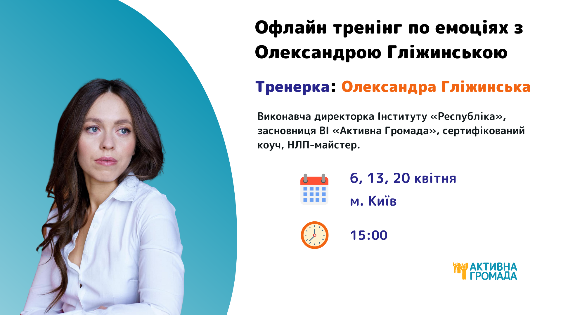Тренерка: Олександра Гліжинська, виконавча директорка Інституту “Республіка”, засновниця ВІ “Активна Громада”, сертифікований коуч, НЛП-майстер