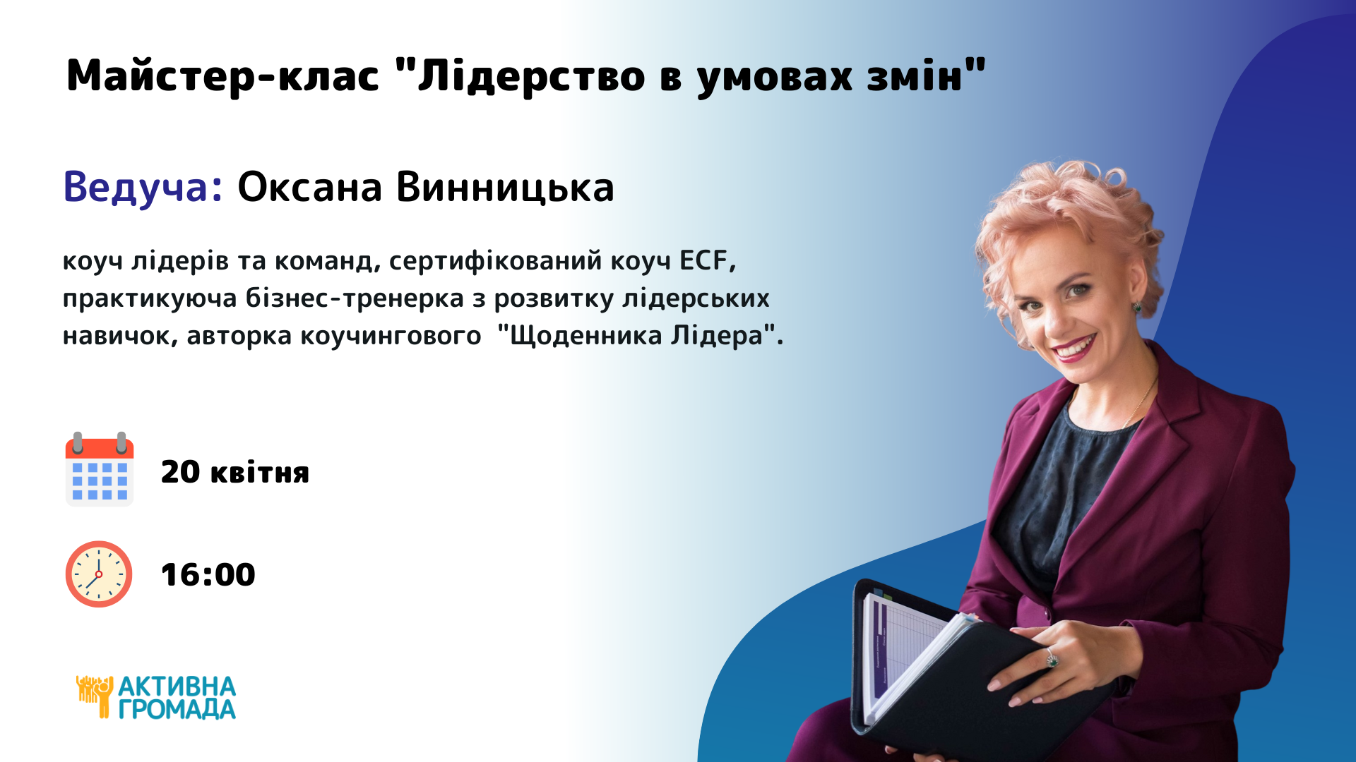 Ведуча: Оксана Винницька, коуч лідерів та команд, сертифікований коуч ECF, практикуюча бізнес-тренерка з розвитку лідерських навичок, авторка коучингового “Щоденника Лідера”