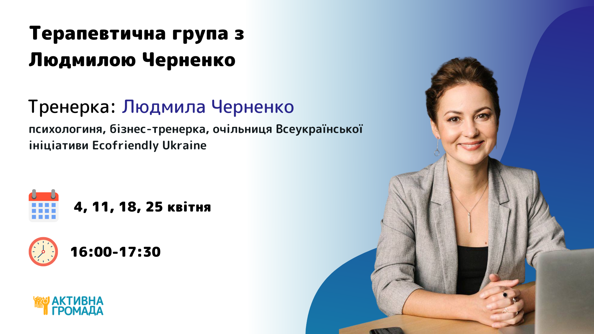 Тренерка: Людмила Черненко, психологиня, бізнес-тренерка, очільниця Всеукраїнської ініціативи Ecofriendly Ukraine