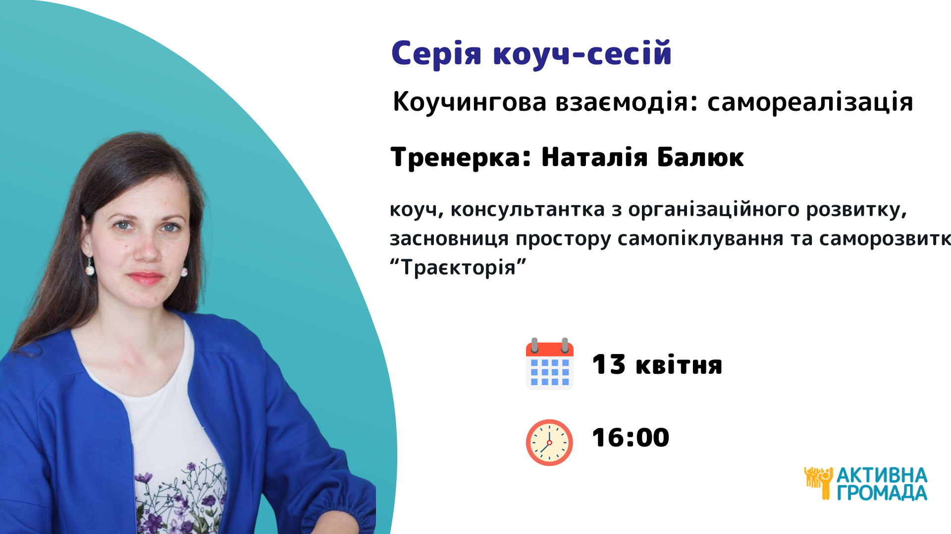 Ведуча: Наталія Балюк, коуч, консультантка з організаційного розвитку, засновниця простору самопіклування та саморозвитку “Траєкторія”