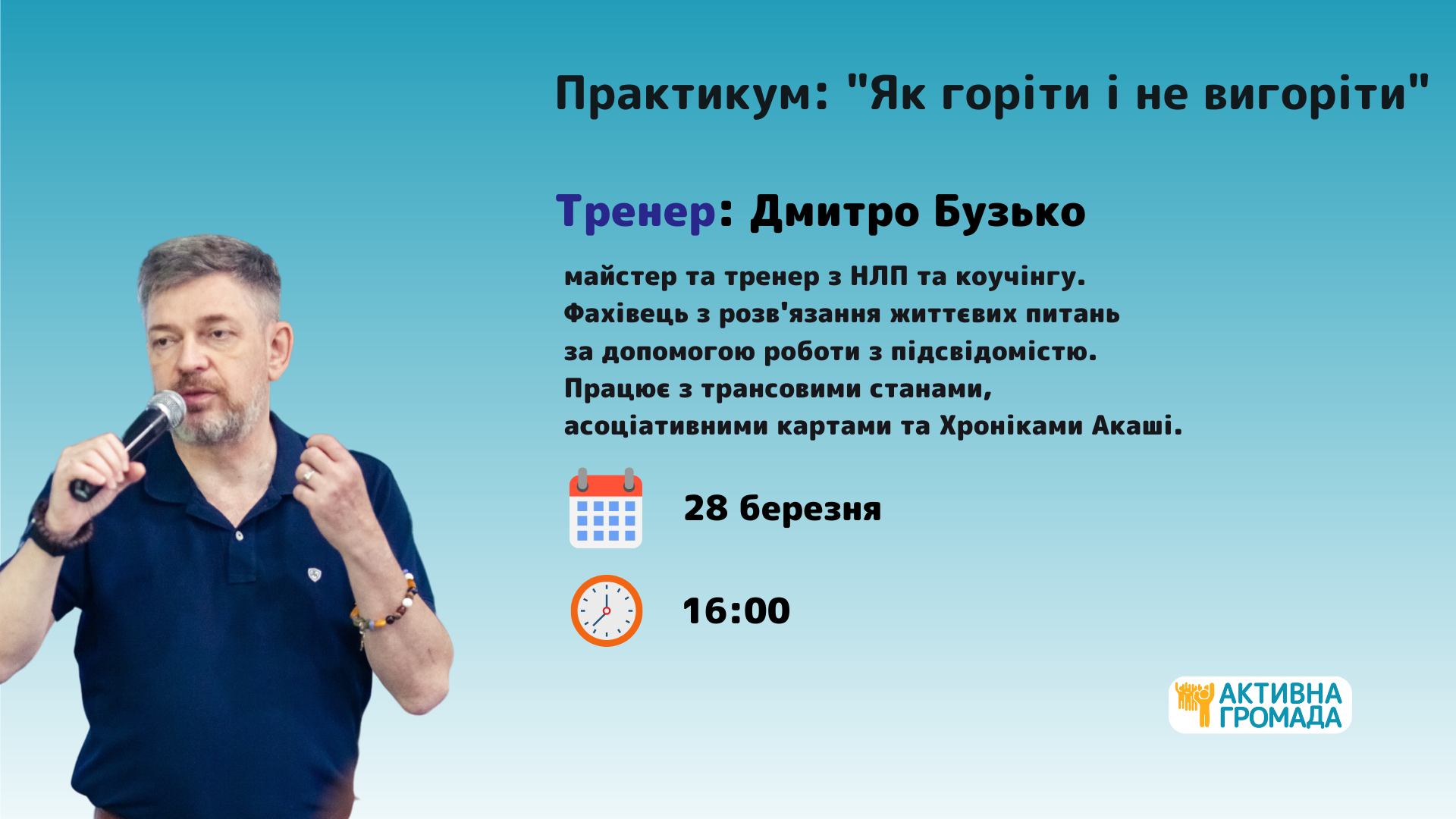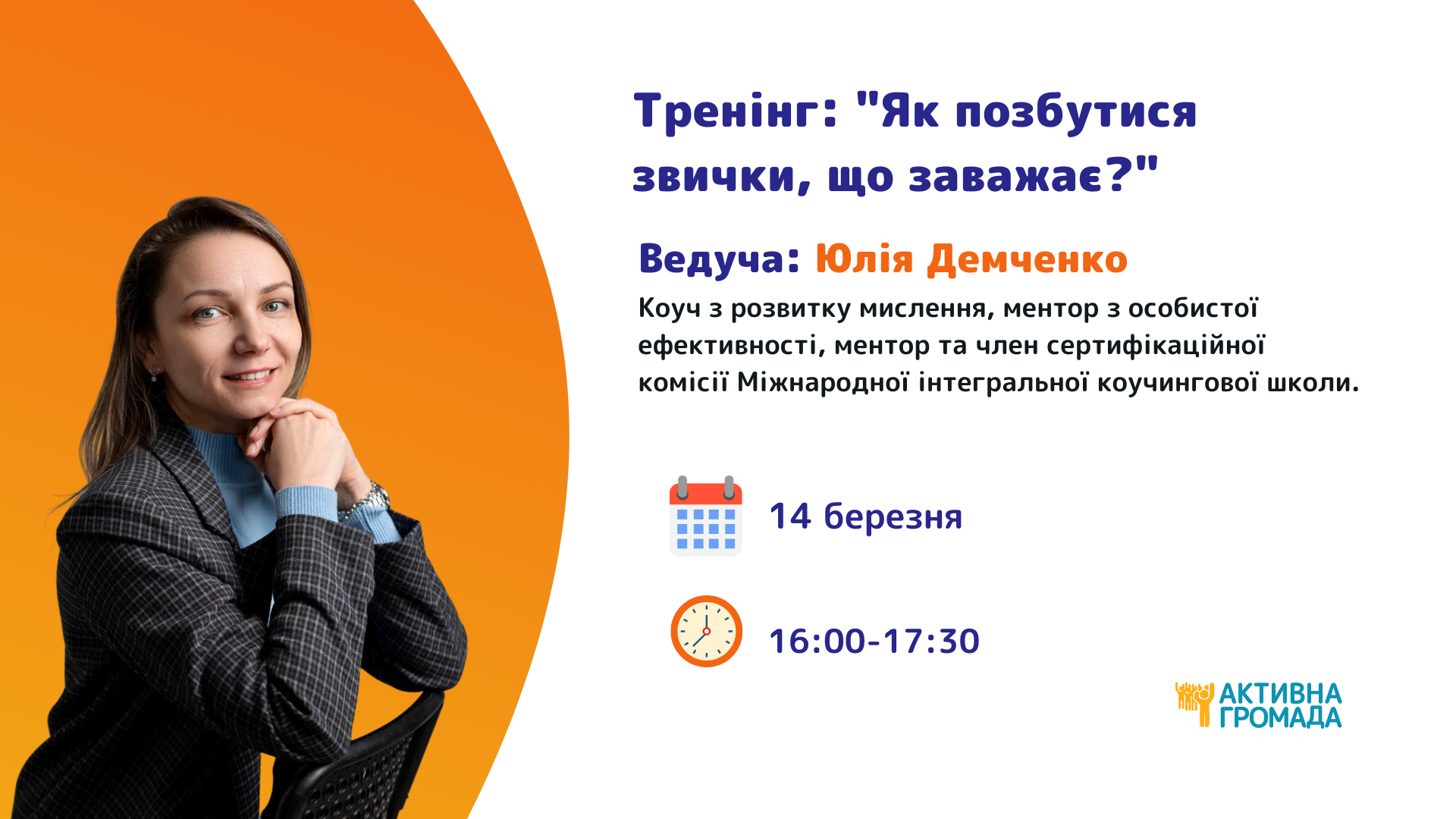 Тренерка: Олександра Гліжинська, виконавча директорка Інституту “Республіка”, засновниця ВІ “Активна Громада”, сертифікований коуч, НЛП-майстер.