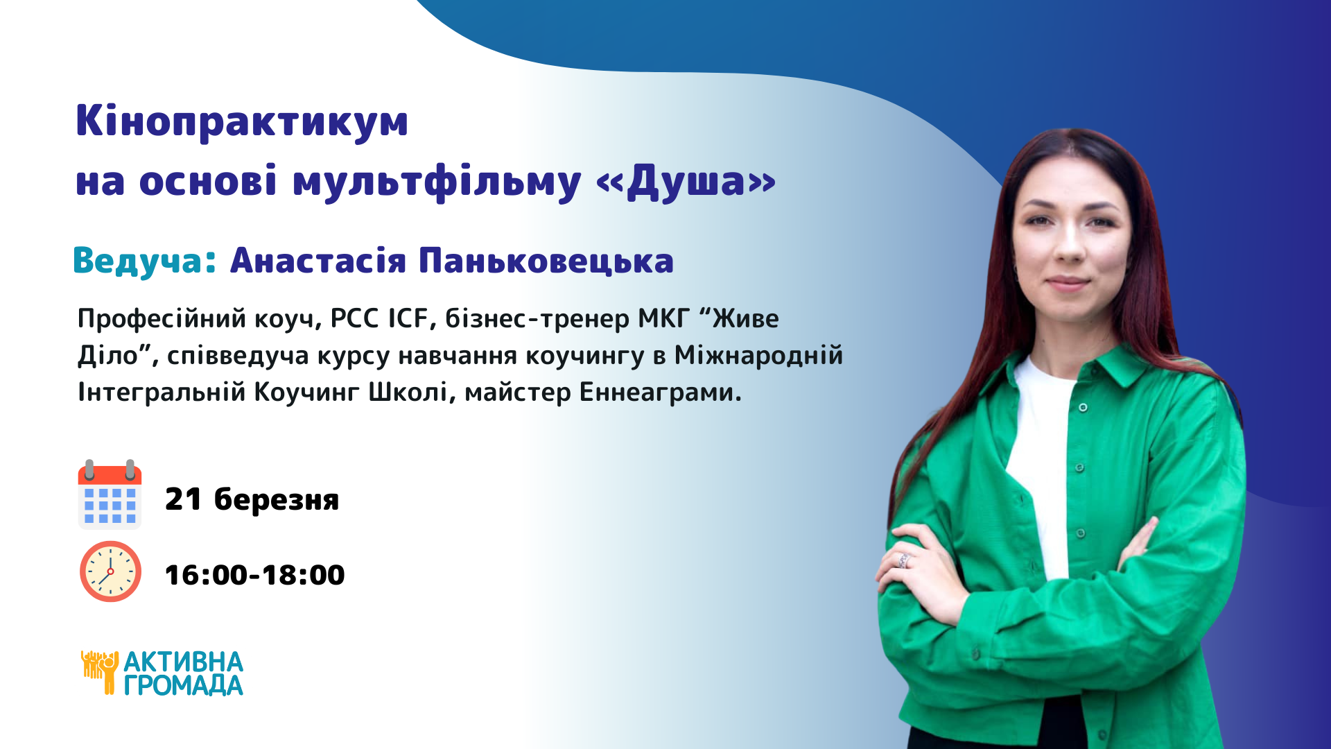 Ведуча: Анастасія Паньковецька, професійний коуч, PCC ICF, бізнес-тренер МКГ “Живе Діло”, співведуча курсу навчання коучингу в Міжнародній Інтегральній Коучинг Школі, майстер Еннеаграми.