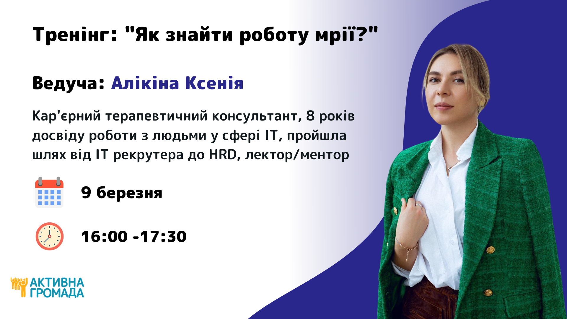 Тренерка: Алікіна Ксенія, кар'єрний терапевтичний консультант, 8 років досвіду роботи з людьми у сфері IT, пройшла шлях від ІТ рекрутера до HRD, лектор/ментор.