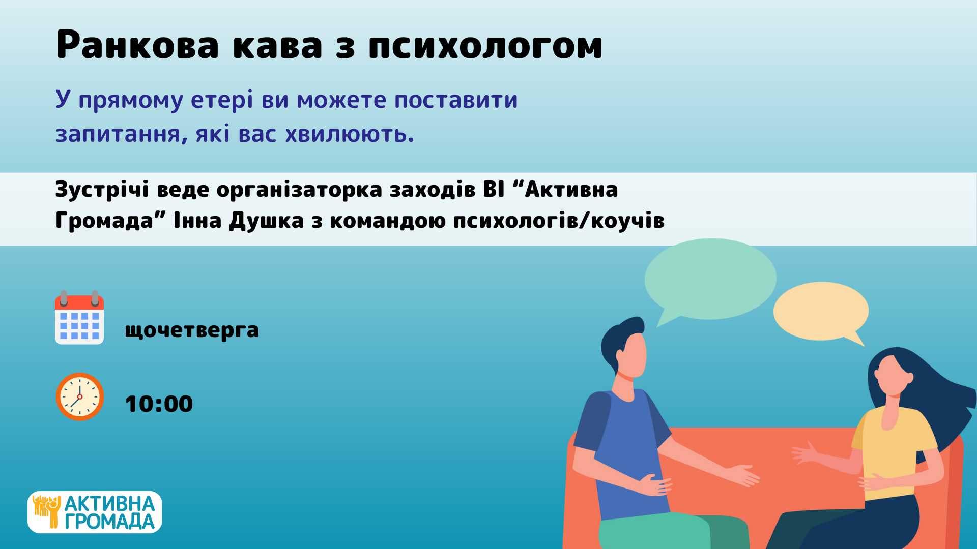 Зустрічі веде організаторка заходів ВІ “Активна Громада” Інна Душка з командою психологів/коучів ВІ “Активна Громада”.