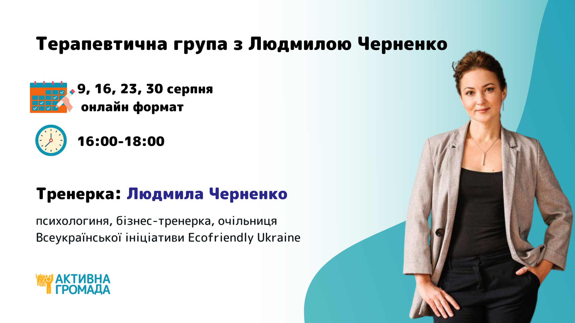 Тренерка: Людмила Черненко, очільниця Всеукраїнської ініціативи Ecofriendly, психологиня, бізнес-тренерка.
