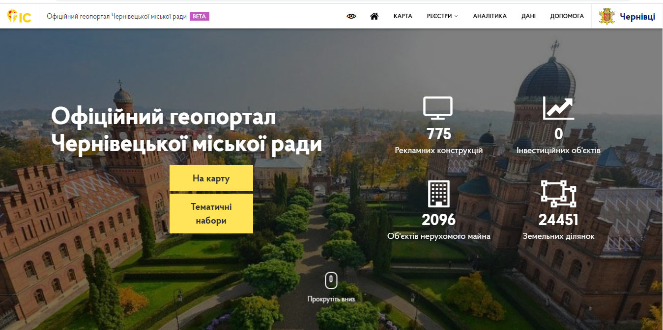 Офіційний геопортал Чернівецької міської ради: http://map.city.cv.ua/ створений для того, аби зробити максимально простим, швидким та ефективним пошук даних по різним геопросторовим об’єктам.