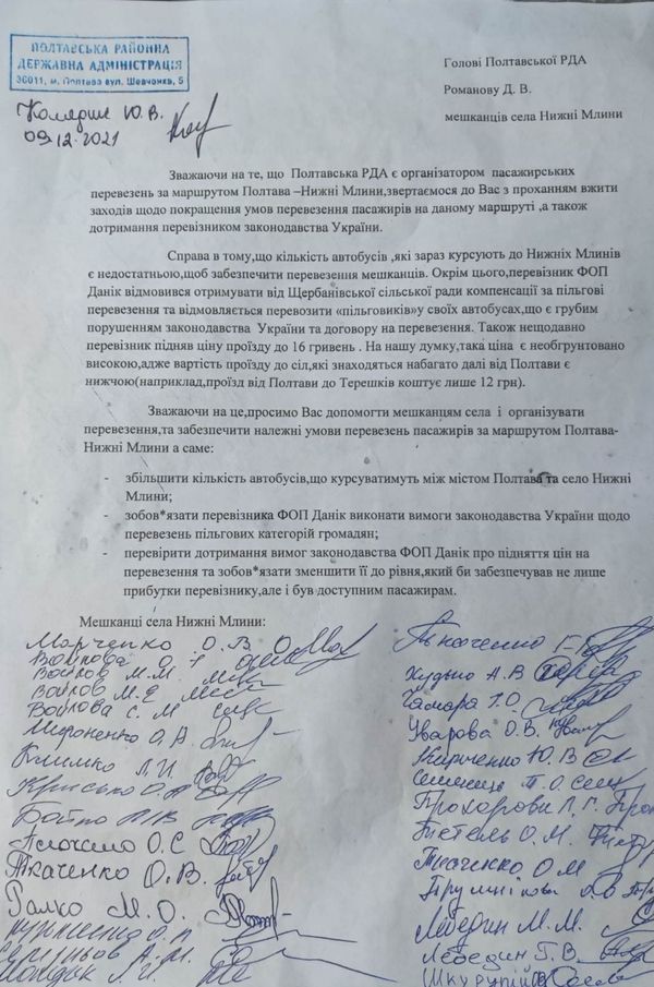 Полтавська РДА є організатором перевезень на маршруті Полтава-Нижні Млини, тому люди звернулися з проханням врегулювати ці питання і забезпечити якісні перевезення.