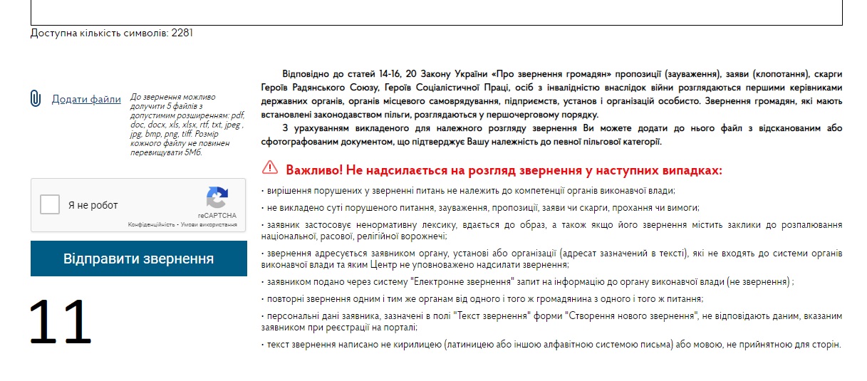 Заповнюємо сам текст звернення. Звернить увагу - внизу сторінки вказано в яких випадках не приймуть Ваше звернення на розгляд