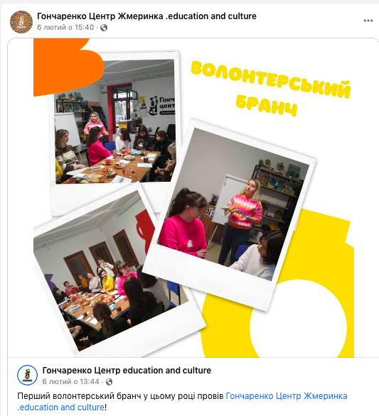 Жінка допомагає іншим волонтерам знаходити один одного. "Гончаренко Центр Жмеринка", за словами Катерини, це такий хаб, де відбувається багато знайомств, де можна зібратись просто, щоб обговорити якісь питання, події та зробити спільну роботу.