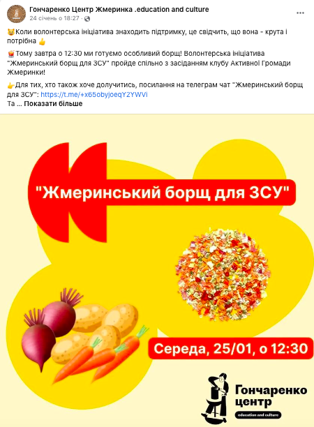 - До речі, дуже правильно сформульовано запитання, тому що мені важко саму себе назвати волонтером. Я допомагаю іншим волонтерам знаходити один одного. У мене робота у досить вигідному місці й багато людей до мене звертаються з того чи іншого питання. Виходить, що це такий хаб, де відбувається багато знайомств, де можна зібратись просто, щоб обговорити якісь питання, події та зробити спільну роботу. Наприклад, найближчим часом у нас запланована зустріч з ініціативи жмеринчанки Анни, яка організувала підвіз 3-ох сушарок для овочів. Місцеві мешканці будуть підносити готові овочі, ми їх будемо сушити й виготовляти суміші для швидкого приготування гарячих страв для наших військових.