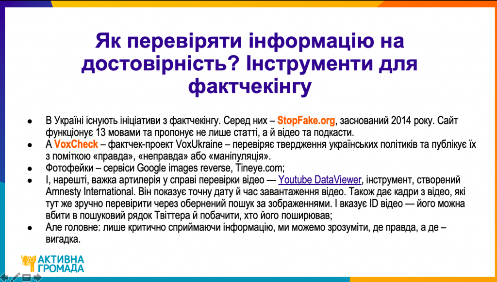 Дізналися, як перевіряти інформацію на достовірність та познайомилися із інструментами для фактчекінгу.