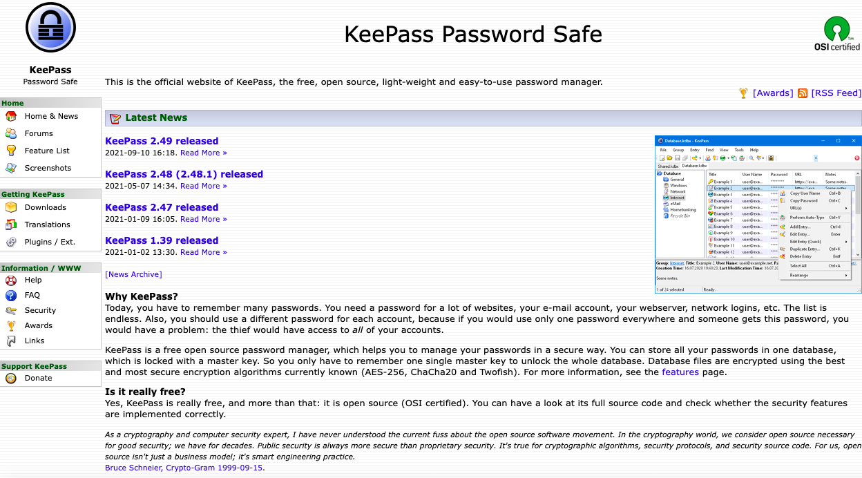 Існує сервіс для зберігання паролів KeePass: https://keepass.info/. Це офіційний веб-сайт, легкий у використанні менеджер паролів з відкритим вихідним кодом.