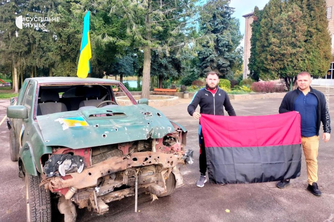 A car of fighters of the 14th separate mechanized brigade, which came under tank fire in Kupiansk, the Kharkiv Oblast, was installed on the central square of Rozhyshche. The car cannot be repaired, so the volunteers plan to raise money for a new vehicle.