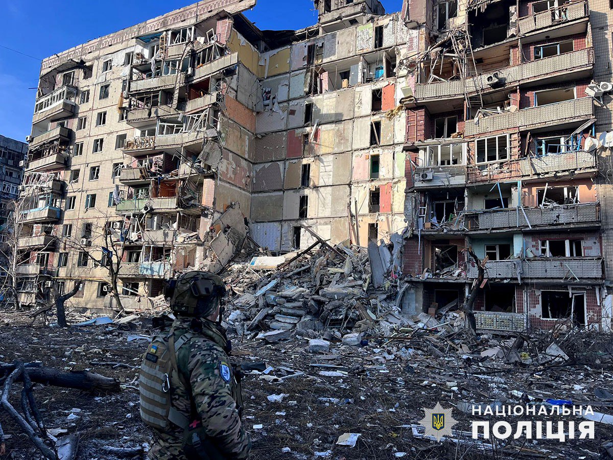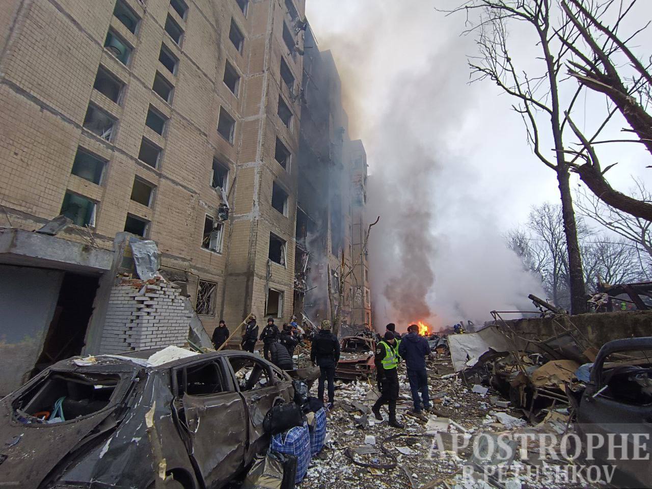 У Солом'янському районі Києва виникли пожежі у двох багатоповерхових житлових будинках. Станом на 17:00 зафіксовано 49 потерпілих, з них 43 людини госпіталізовані, двоє киян загинуло. Із багатоповерхівки в Солом'янському районі евакуювали понад 130 людей. Близько 20 деблокували рятувальники. В одній зі шкіл Солом'янського району облаштували пункт обігріву та допомоги для мешканців пошкоджених будинків. На місці працює «Червоний Хрест Україна» і ДСНС.