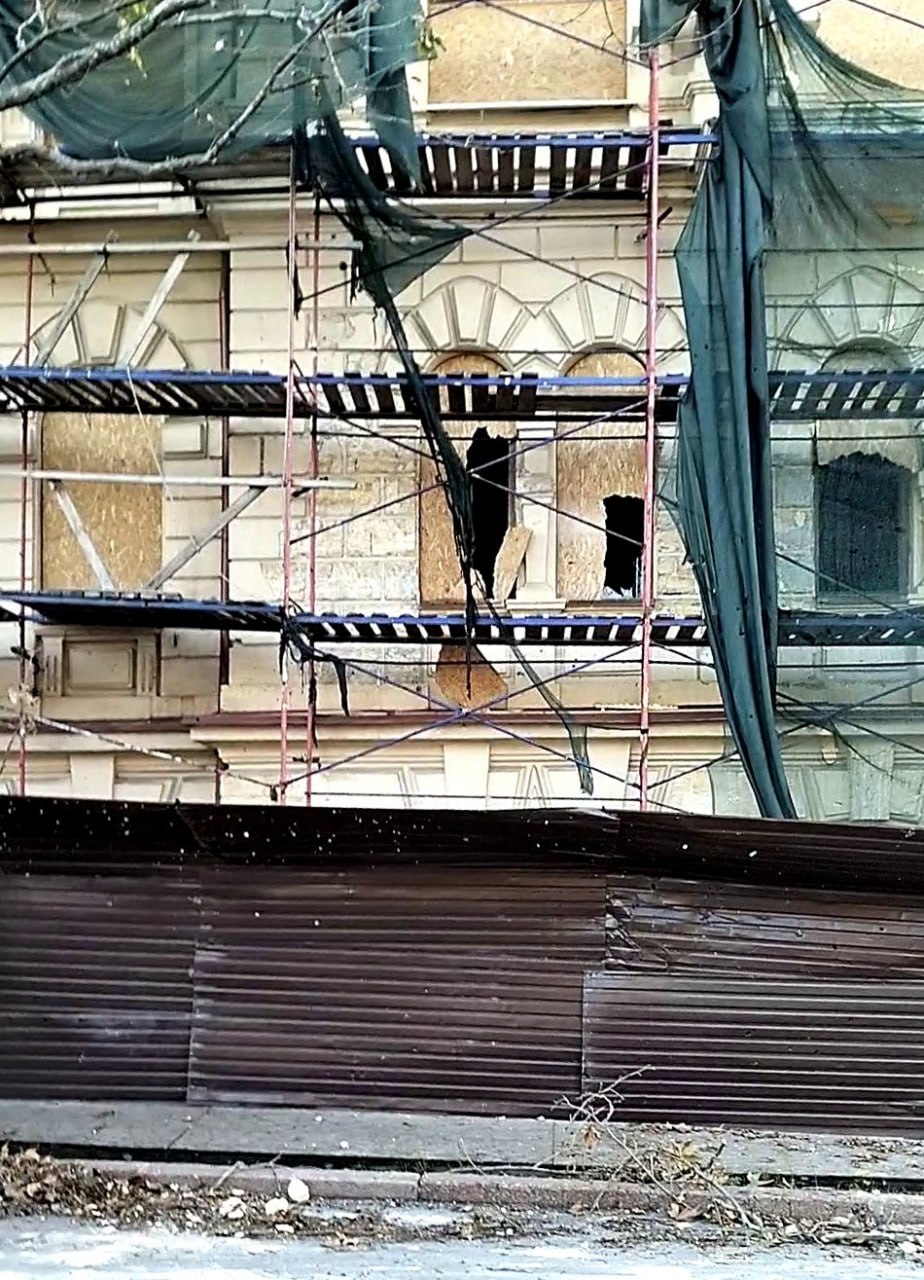 Вночі під російський обстріл втретє потрапив Херсонський художній музей. Уламки пошкодили фасад будівлі та пройшли крізь закриті OSB-плитами вікна і прошили стіни всередині.