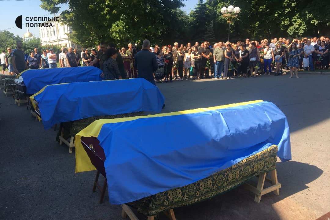 У Полтаві біля Свято-Успенського собору прощаються з шістьма воїнами, які полягли за Україну: Сергієм Окарою, Віталієм Стаськом, Андрієм Хозяйновим, Олексієм Поліщуком, Олександром Чипенком та Максимом Безруковим.