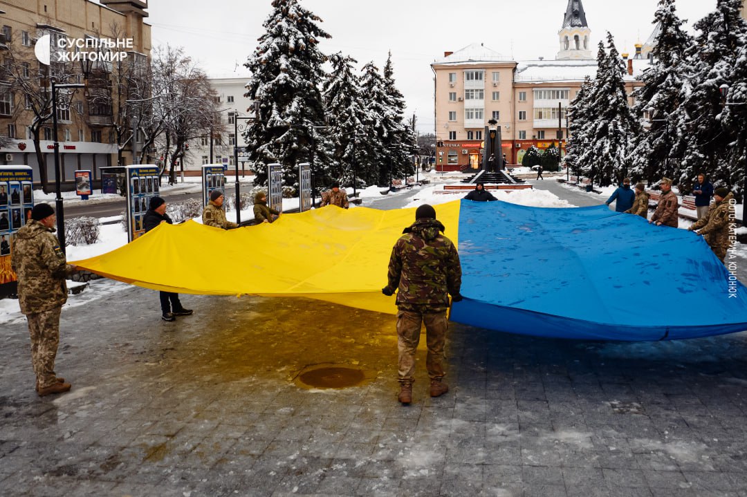 Прапор України з Соборного майдану Житомира, який був пошкоджений вітром, передали доньці військового однієї з житомирських бригад. В подальшому прапор використають для збору коштів для ЗСУ в різних країнах.