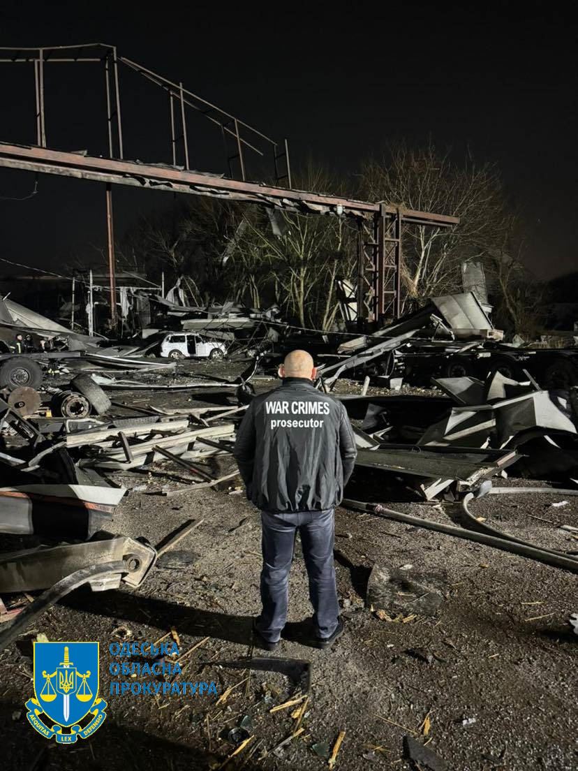 В Одеському районі уламками іншого збитого дрона пошкодили одну з будівель припортової інфраструктури. Люди не травмувались.