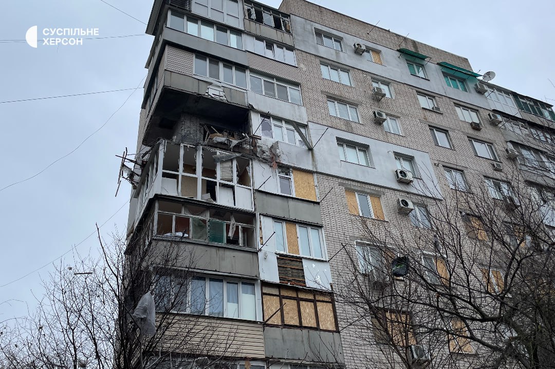 Сьогодні зранку російська армія вчергове атакувала Херсон. Пошкоджений багатоповерховий будинок, снаряд влучив у квартиру на шостому поверсі.