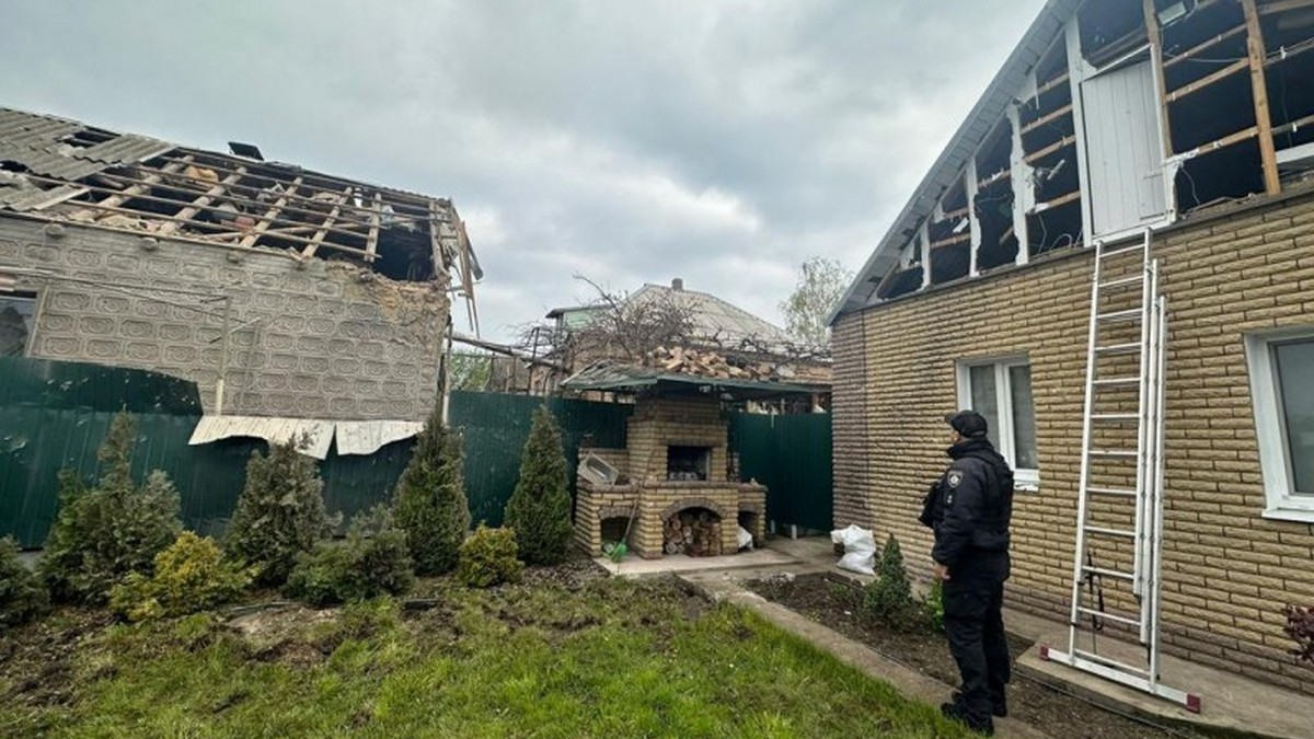 Російські війська 13 квітня скинули вибухівку з дрона на службовий автомобіль поліцейських, які патрулювали Новоберислав. Поранений один правоохоронець.
