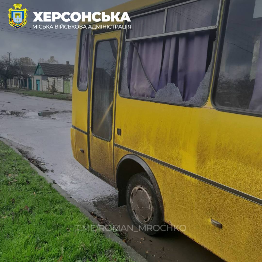 Під обстріл військ рф у Херсоні потрапив громадський транспорт. В автобусі вибиті вікна. Інформації про загиблих та поранених немає.
