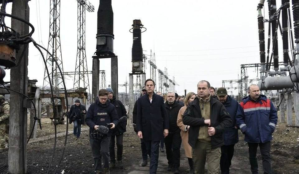 Прем’єр-міністр Нідерландів Марк Рютте відвідав зруйновану Трипільську ТЕС у Київській області. Станція була пошкоджена внаслідок влучання російського снаряда 24 лютого торік.