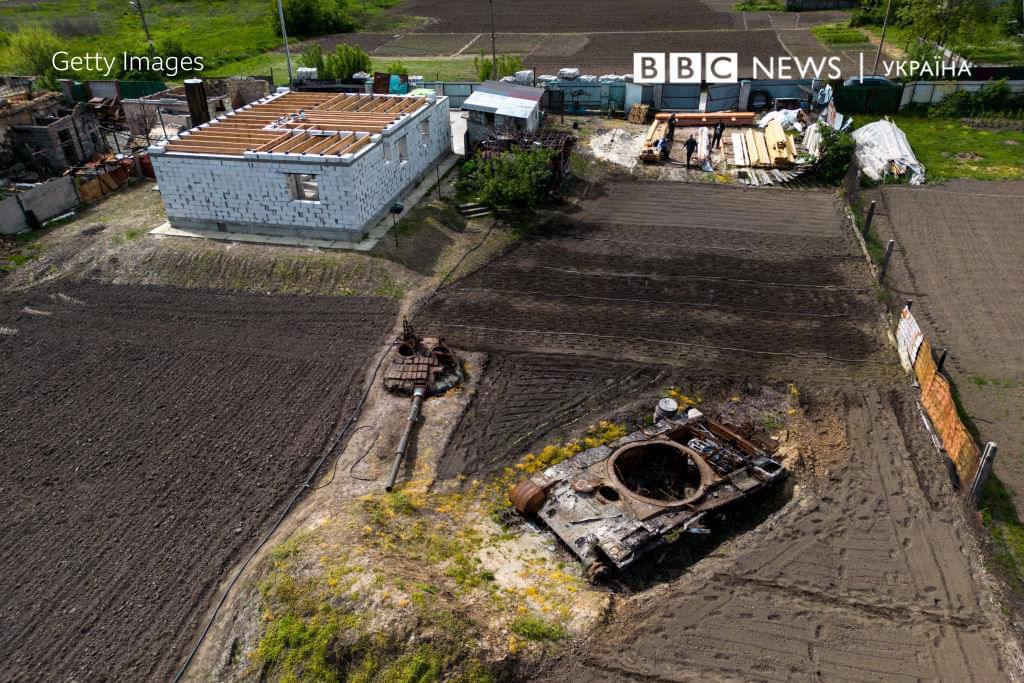 У селі Велика Димерка місцеві засаджують городи просто між пошкодженою технікою окупантів. Також власники земельної ділянки почали відбудову дому, знищеного під час бойових дій, які тривали на Київщині у лютому-березні минулого року.