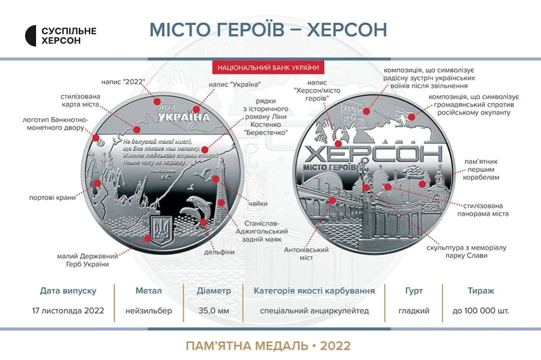 У Херсоні на площі Свободи Нацбанк України презентував першу пам’ятну медаль із серії, присвяченої містам-героям. Вона називається "Херсон — місто героїв". Дизайн медалі розробила художниця Наталія Фандікова.