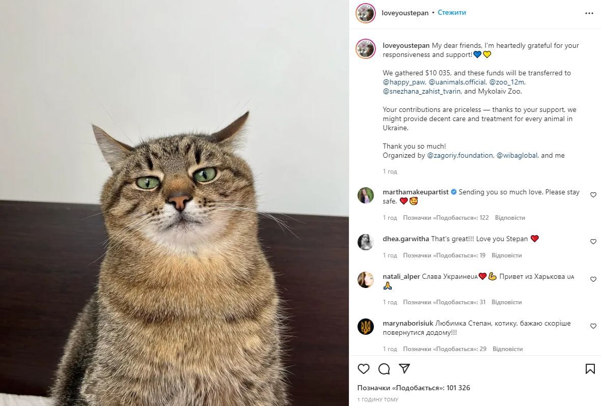 Популярний в соцмережах кіт Степан з Харківщини зібрав десять тисяч доларів для допомоги тваринам в Україні.