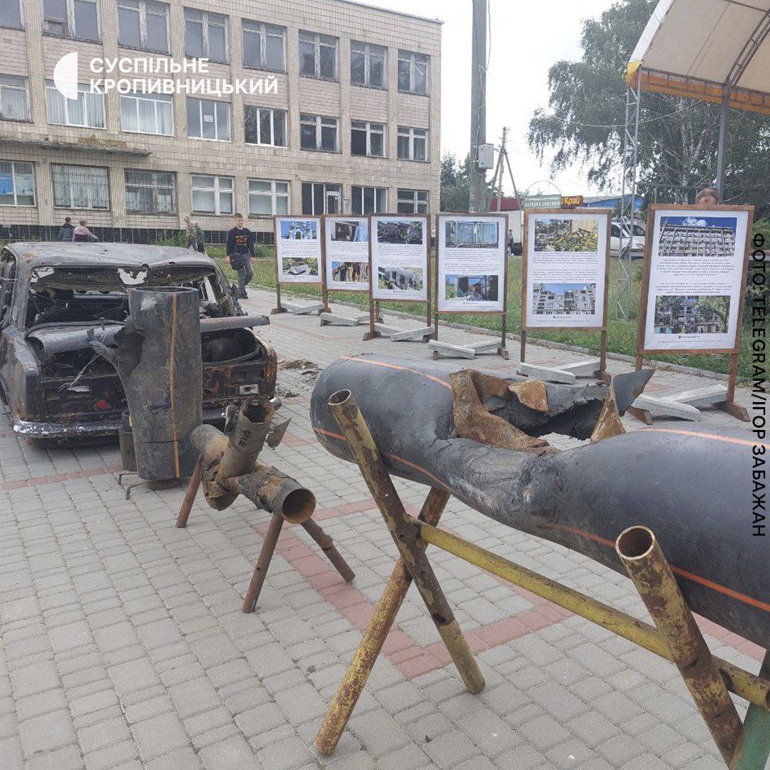 У місті Новомиргород Кіровоградської області просто неба відкрили виставку наслідків російсько-української війни в Донецькій області. Там розмістили обстріляну російськими військовими машину, розірвані труби, стенди з світлинами зруйнованих будинків, церков, уламків ракет.