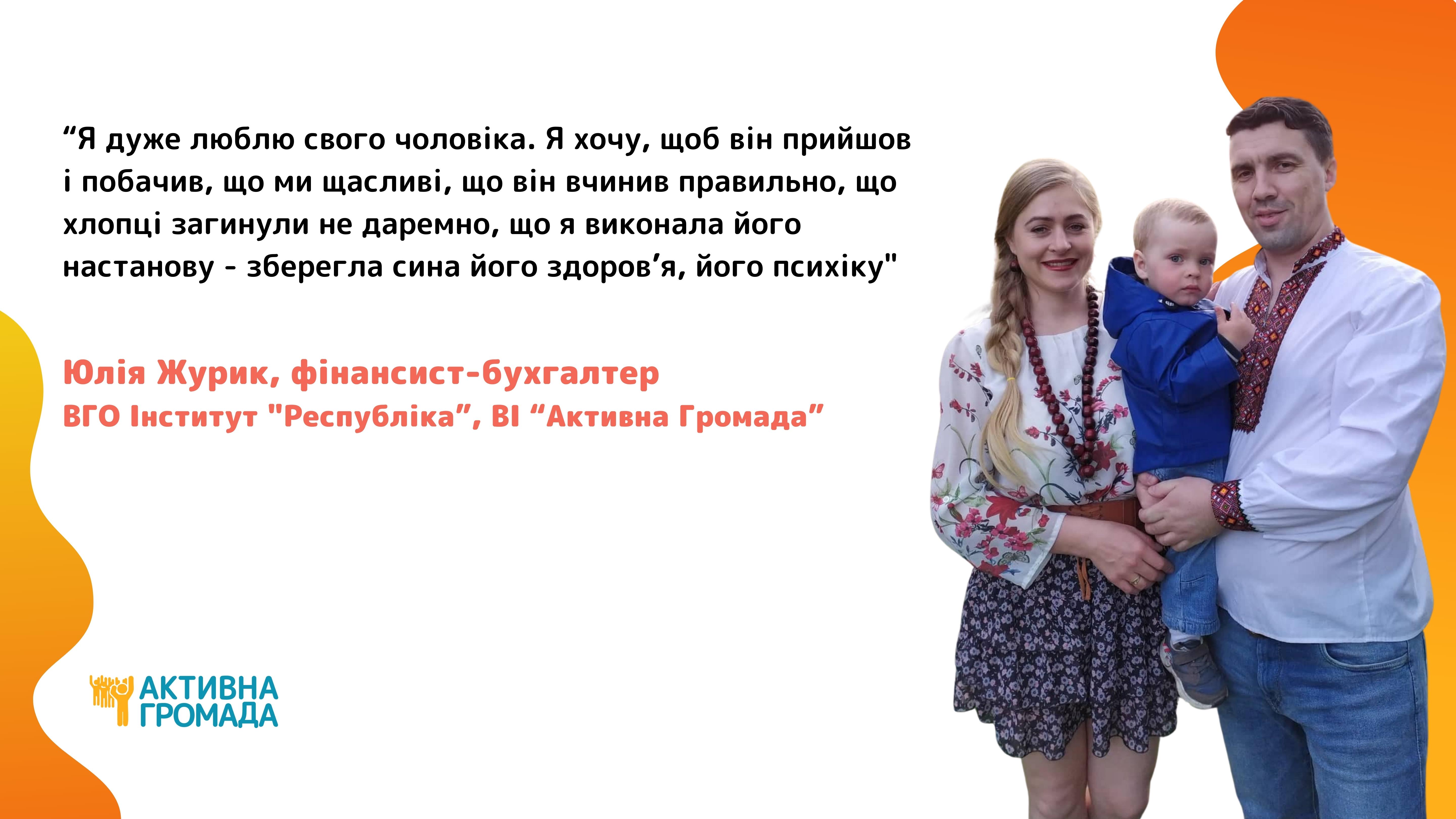 “Чоловік повернувся і сказав, що через годину повністю зібраний має бути у воєнкоматі. Він зібрався за 20 хвилин, ми обійнялися, я зробила на пам’ять фото нас трьох і він побіг, сказавши: “Я не знаю, чи правильно я роблю, що вас лишаю, але я мушу йти. Бережи нашого сина”. Він вже стояв на сходах коли говорив ці слова, я бачила його стан. Я намагалася збирати речі, щось носити в машину, я ходила по квартирі, як в якійсь прострації”.