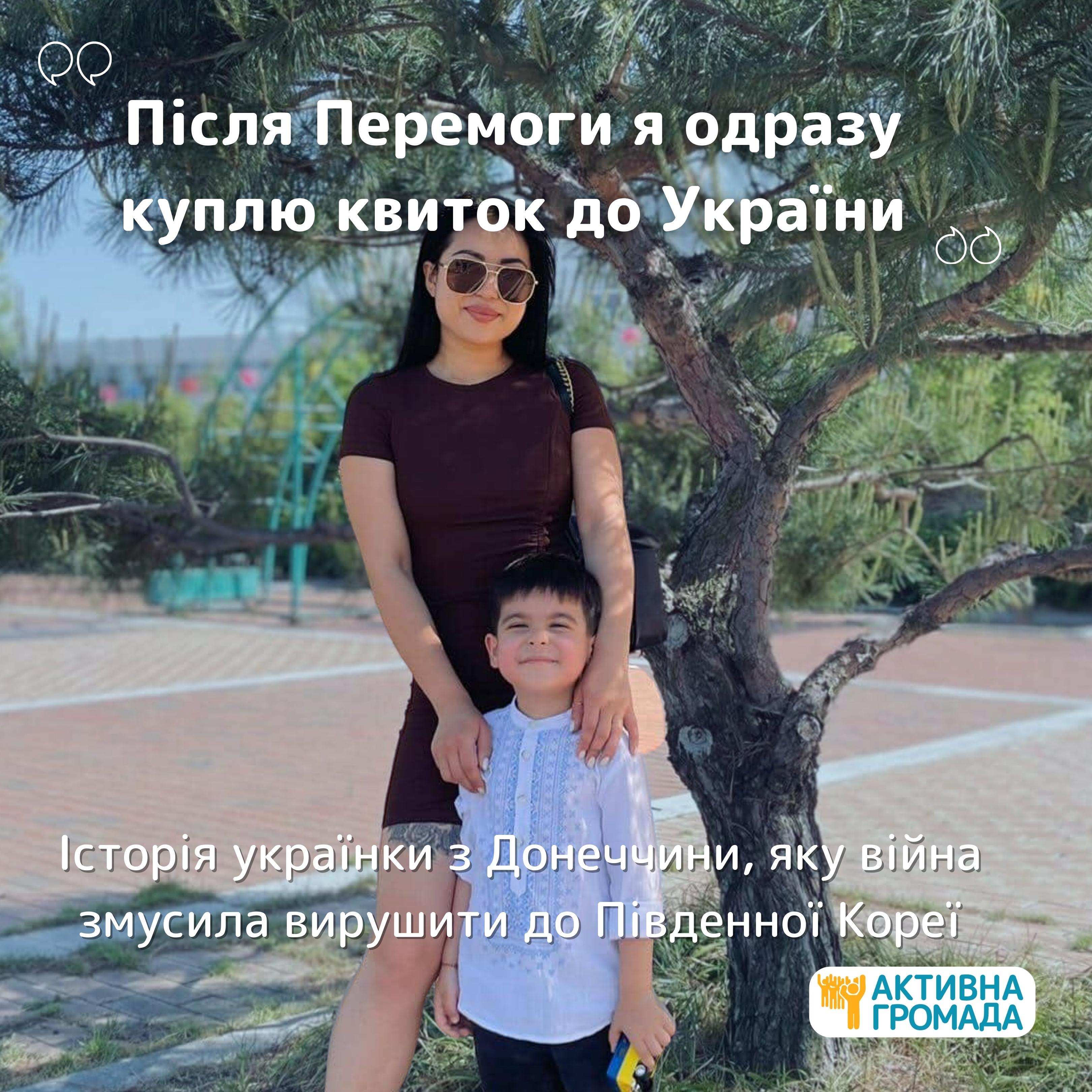 В Кореї я працюю. Розумію, що мені треба якось підіймати дитину. Мати гроші, аби самій тут існувати. Ті ж самі квитки купити, вони коштують чимало – 1000 доларів. Думаю, ну нехай, завтра кажуть: “мир в Україні”, а в мене повинні бути гроші, щоб я могла купити ці квитки. Хотілося б мені бути в рідній країні, бути корисною, але я розумію, що в мене є дитина, це моє майбутнє. Це майбутнє України, мені треба його берегти і зробити все, щоб моя дитина не почула вибухів і стрільби. Він поводиться добре, в нього немає психологічної травми. Але він щодня говорить про війну. Дуже чітко розпізнає жовто-блакитні кольори, де б він не побачив. Він ідентифікує себе українцем. І він знає, що таке війна. Знає, що в Україні стріляють, каже: “бідні дід, баба, папа, Мотя – наш котик, що залишились дома, де стріляють”. Звісно заради дитини треба потерпіти, а потім я вже приїду і буду корисна вдома.