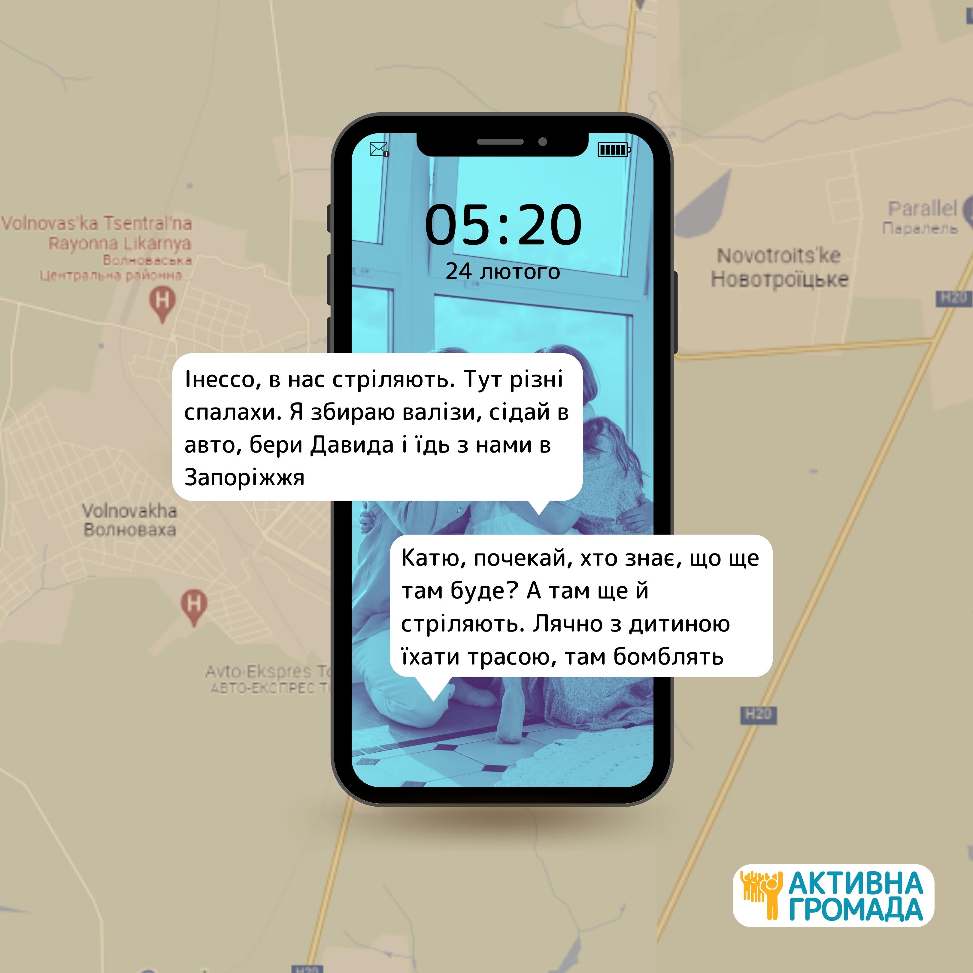 Мав бути зелений коридор з 9 до 11. Але ми знаємо, що Донецькій області – Волноваха, Новотроїцьке, Маріуполь, ніяких зелених коридорів ніхто не може гарантувати. Стріляють. Сирен не було взагалі, ми дізнавались про те, що впала ракета, коли вона вже впала.