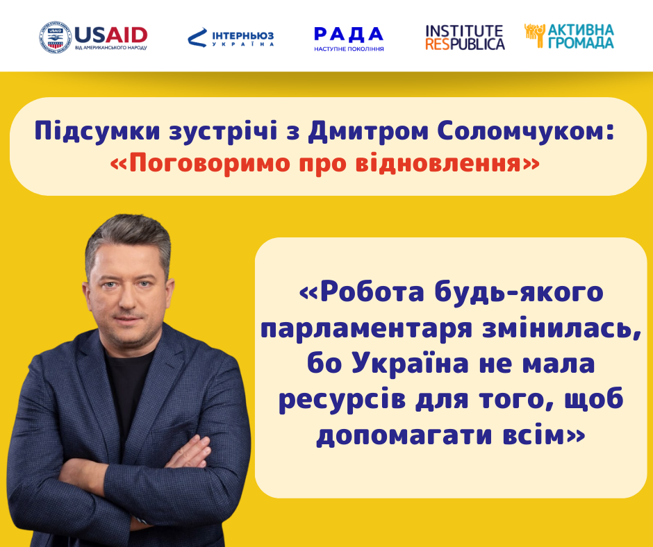 Про проєкт: участь у заходах сприяє підвищенню рівня обізнаності населення про функції депутатів ВРУ, методів взаємодії з ними та обговорення плану відновлення і розвитку країни у воєнний та повоєнний період. Також — сприятиме розвитку діалогу між депутатами ВРУ та громадянами щодо розробки проєктів законів щодо відновлення за допомогою публічних консультацій.