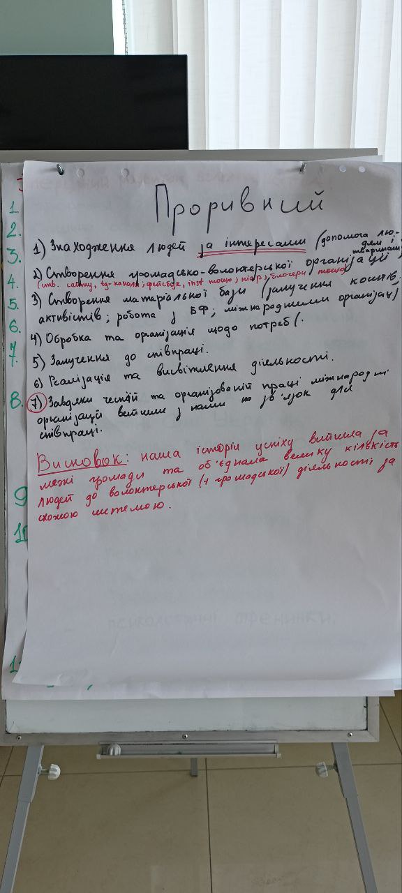 У Проривному сценарії учасники створювали волонтерський рух з нуля: «Звісно, нам це вдалося. Ми знайшли людей за інтересами, людей, які будуть нашими співбраттями. Друга мета – створення громадської волонтерської організації», - зазначив спікер.
