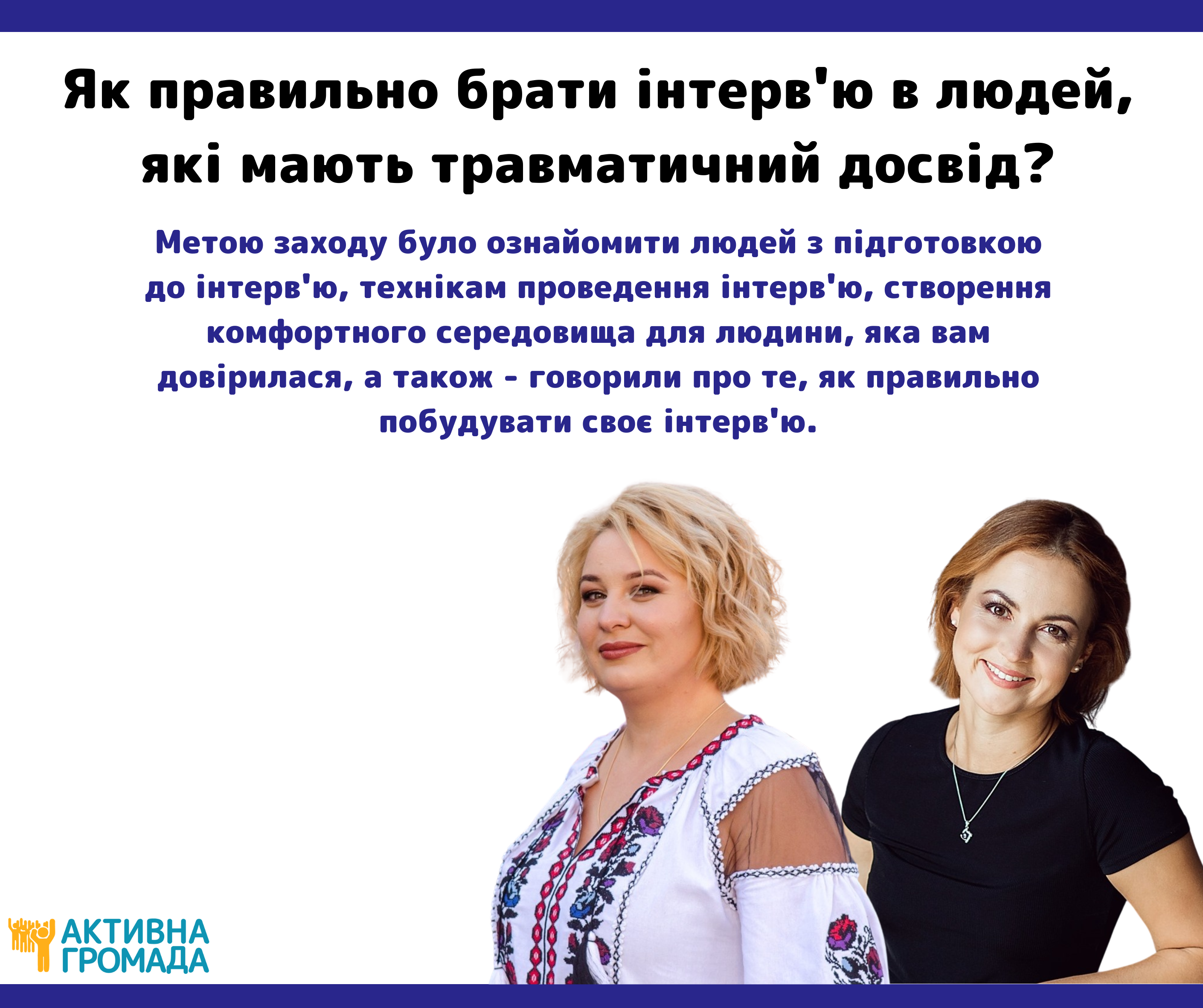 ВІ "Активна Громада" 22 липня 2022 року провела тренінг на тему: “Як правильно брати інтерв'ю в людей, які мають травматичний досвід”.
