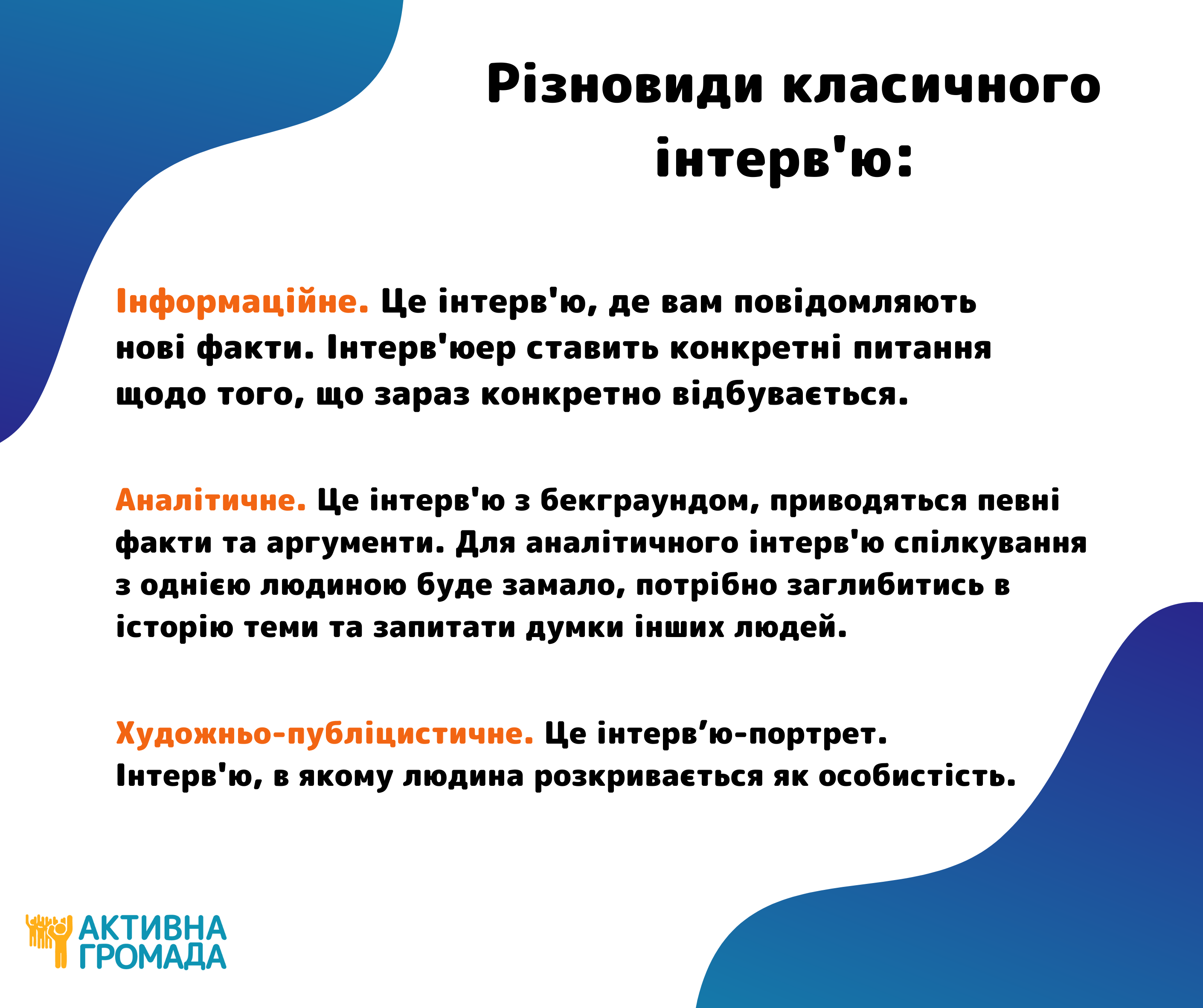- Інформаційне. Це інтерв'ю, де вам повідомляють нові факти. Інтерв'юер ставить конкретні питання з того, що зараз конкретно відбувається. Прикладами є Арестович та Фейгін, які повідомляють останні новини з фронту.