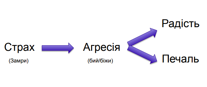 Коли включається наш рептильний мозок, тоді перша емоція, яку ми відчуваємо, це страх. Система завмирання. Інколи люди кажуть, що вони не відчували страху. Насправді, він був дуже коротким, люди могли його не помітити. Але наш організм працює таким чином, що всі ці емоції ми відчуваємо. Після страху наступна емоція - агресія (бий або біжи), а після цього - радість або печаль. В залежності від ситуації.