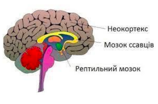 1. Рептильний мозок – відповідає за виживання. Це єдине, що працює у шокових ситуаціях: завмерти, бігти, боротися.