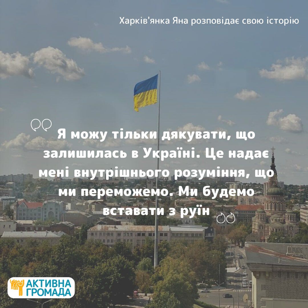 “Я можу тільки дякувати, що залишилась в Україні. Це надає мені внутрішнього розуміння, що ми переможемо. Ми будемо вставати з руїн”, – каже Яна.