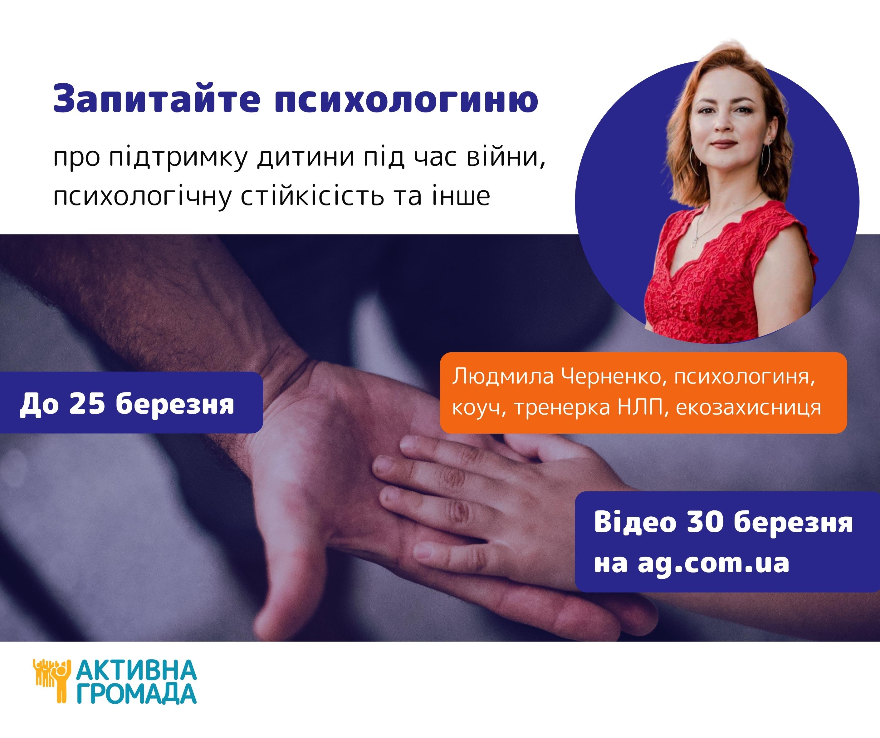 ВІ "Активна Громада" організовує онлайн вебінар з психологинею, тренеркою НЛП Людмилою Черненко. Вебінар покликаний підтримати ваш психологічний стан та надати розуміння, як підтримати свою дитину в цей непростий час.