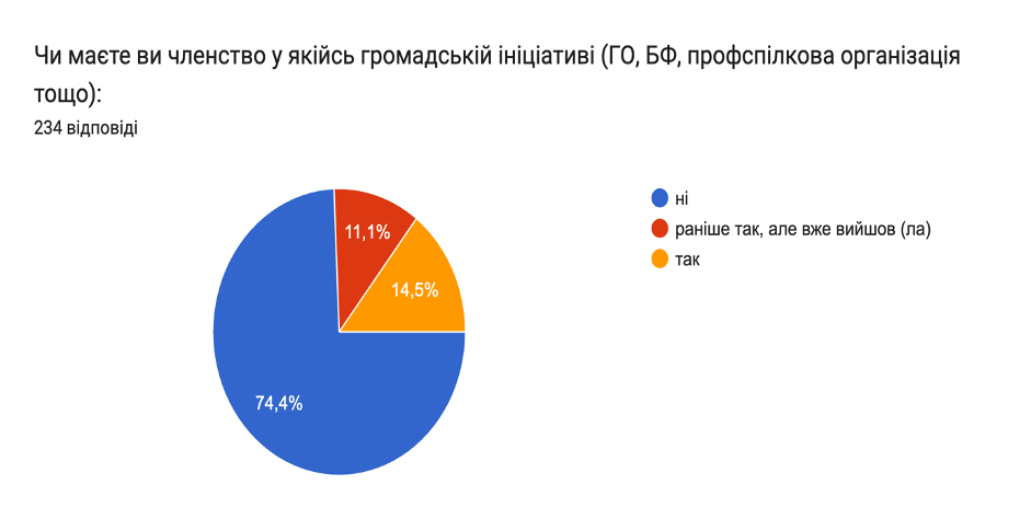 1. Тільки 14,5% респондентів визначили свою приналежність до будь-якого формату громадських організацій чи ініціатив, тоді як 74,4% не мають таких горизонтальних зв’язків. Це свідчить про низький рівень кооперації мешканців в аспекті громадського життя та недостатню кількість дієвих громадських ініціатив.