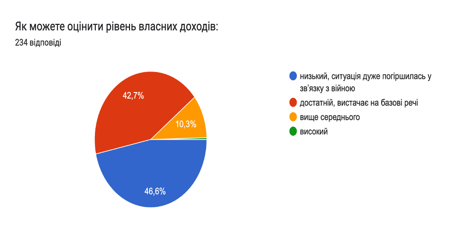 2. 46,6% респондентів оцінили власний рівень доходів як низький зокрема через військові дії. 42,7% зазначили, що мають достатній рівень доходів, який дозволяє закривати базові життєві потреби. 10,3% опитаних зазначили рівень доходів як «вище середнього» й жоден респондент не вважає, що має «високий рівень доходів». Показники оцінки економічної ситуації в громаді критичні.